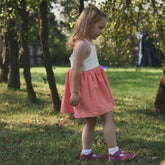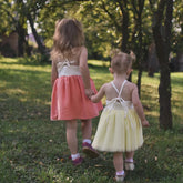 Krásný dětský střih pro první narozeninové šaty nebo šaty na svatbu. Základem střihu je pevný živůtek lněný nebo mušelínový, můžete použít ale i krajku. Živůtek se zavazuje okolo krku přes záda.